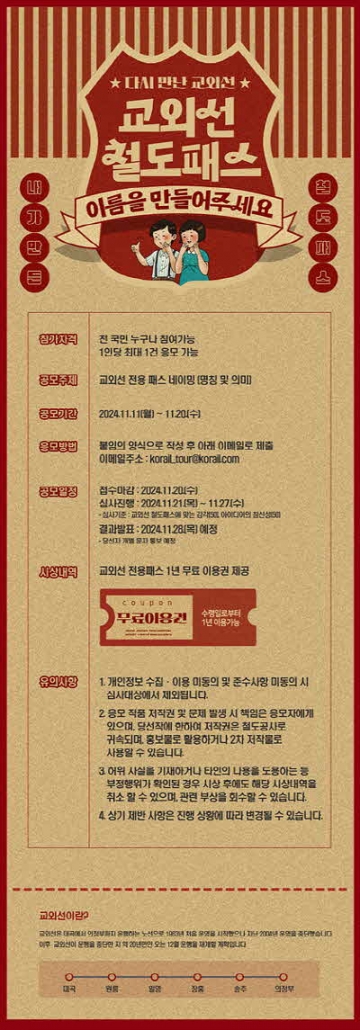 코레일은 경기도와 고양, 양주, 의정부시와 함께 △교외선 철도패스에 적합한 감각 △아이디어의 참신성 등을 기준으로 심사할 예정이다. 당선자에게는 교외선을 1년 동안 자유롭게 이용할 수 있는 ‘교외선 1년 무료 패스’가 증정된다.