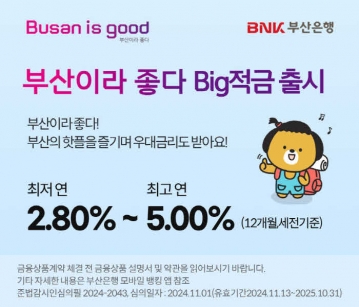 부산시(시장 박형준)가 BNK부산은행과 손잡고 부산의 주요 관광지를 방문하며 높은 금리를 제공받을 수 있는 ‘부산이라 좋다 Big적금’을 출시한다고 밝혔다. 이번 적금 상품은 부산의 도시브랜드 「부산이라 좋다(Busan is good)」를 주제로 기획되어, 부산을 여행하며 기록하는 즐거움과 동시에 지역경제 활성화를 목적으로 한다.