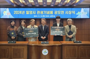 밀양시(시장 안병구)는 지난 14일 시청 소회의실에서 ‘2024년 밀양시 관광기념품 공모전’ 시상식을 개최했다. 이날 행사에는 이종황 행정국장, 김효경 관광진흥과장, 수상자 등 10여 명이 참석해 수상작과 함께 밀양의 관광 매력을 기념하는 시간을 가졌다.