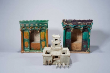 상형자기는 사람, 동물, 건물 등의 실체 형태를 본떠 만든 도자기로, 고대에는 주로 신을 모시는 제단 용도로 사용되거나 무덤의 껴묻거리로 제작되었다. 이후 감상용이나 완구로도 활용되며 그 쓰임새가 다양해졌다. 이번 전시에는 삼채 감실과 토제 가옥 등이 출품되는데, 삼채 감실은 황색, 녹색, 감색의 강렬한 색상 대비가 돋보이는 작품으로, 화려하면서도 소박한 디자인에 내세의 안식을 기원하는 염원이 담겨 있다.