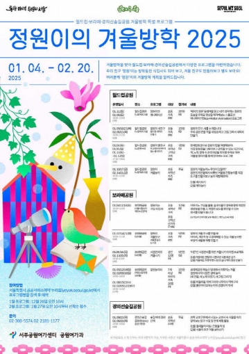 이수연 서울시 정원도시국장은 “공원의 풍부한 생태·환경 자원을 활용해 남녀노소 누구나 즐길 수 있는 다채로운 프로그램을 마련했다”면서 “방학을 맞은 아이들과 시민들이 서울의 공원에서 특별하고 유익한 겨울을 보내시길 바란다”고 말했다.