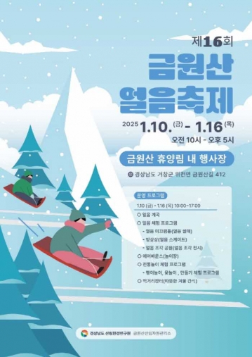 금원산산림자원관리소는 오는 1월 10일부터 16일까지 7일간 청정 계곡과 숲이 어우러진 금원산자연휴양림 일원에서 제16회 금원산 얼음축제를 개최한다고 밝혔다. 경남의 대표적인 겨울축제로 자리 잡은 금원산 얼음축제는 자연 속에서 겨울의 매력을 만끽할 수 있는 다채로운 프로그램으로 지역 주민과 관광객들을 맞이할 준비를 마쳤다.