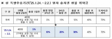 코레일은 1월 24일부터 2월 2일까지 열흘간 설 승차권의 환불 위약금을 기존보다 강화한다. 열차 출발 시각을 기준으로 2일 전까지는 최저 위약금 400원을 부과하며, 1일 전에는 승차권 금액의 5%, 당일 출발 3시간 전까지는 10%, 3시간 이내부터 출발 시각 전까지는 20%, 출발 후 20분까지는 30%의 위약금을 적용한다.
