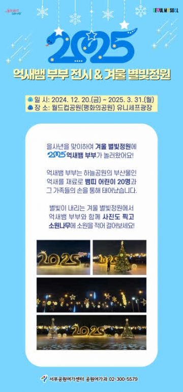 서울시 서부공원여가센터는 2025년 을사년을 맞아 월드컵공원 평화의공원 유니세프광장에서 ‘억새뱀 부부 전시’와 ‘겨울 별빛 정원’을 개최하며 시민들에게 특별한 겨울 체험을 선사한다. 이번 행사는 2025년 1월 7일부터 3월 31일까지 약 3개월간 운영되며, 누구나 자유롭게 방문해 즐길 수 있다.