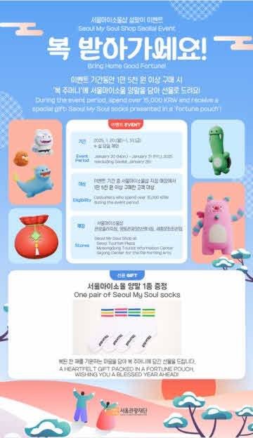 이벤트 기간 동안 서울굿즈를 1만 5천 원 이상 구매한 고객에게는 서울마이소울 양말과 복주머니가 증정된다. 복주머니는 새해 복을 기원하는 의미를 담고 있으며, 증정 품목인 서울마이소울 양말은 고객들에게 꾸준히 사랑받아온 스테디셀러 상품으로 높은 만족도를 자랑한다.