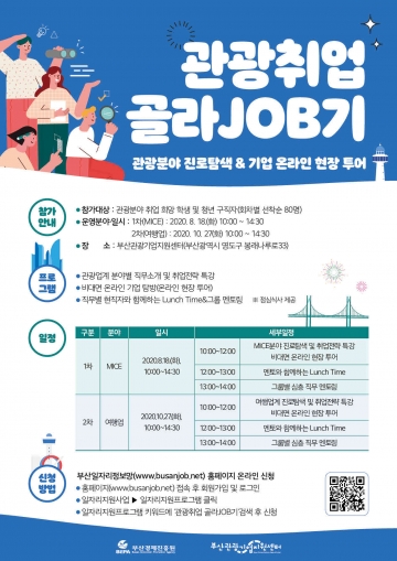 부산광역시와 부산관광기업지원센터(이하 센터)는 부산경제진흥원 및 부산컨벤션산업협회(이하 협회)와 함께 국제관광도시 부산의 미래 관광 인재 육성을 위한 관광분야 진로 탐색 및 온라인 기업 투어 프로그램을 오는 18일(화)과 10월 27일(화)에 총 2회에 걸쳐 진행한다.