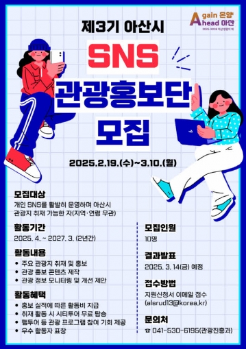 아산시가 ‘2025-2026 아산 방문의 해’를 맞아 아산시의 관광 명소, 축제, 다양한 문화·관광 프로그램을 홍보할 제3기 SNS 관광홍보단을 모집한다.