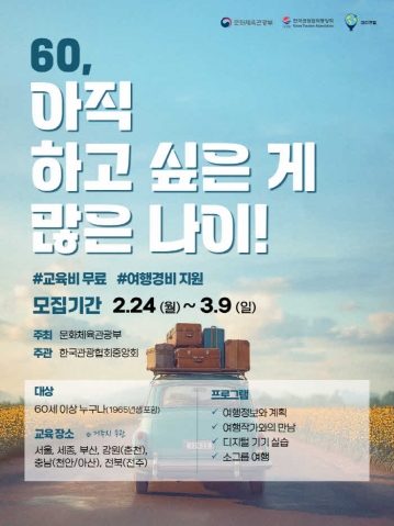 한국관광협회중앙회(회장 이경수)는 문화체육관광부와 함께 60세 이상 활동적 장년의 건강한 여행문화 조성을 위해 추진하는‘2025 꿈꾸는 여행자’의 수강생을 서울, 부산, 세종, 강원(춘천), 충남(천안·아산), 전북(전주) 등 전국 각지에서 오는 3월 9일(일)까지 모집한다.