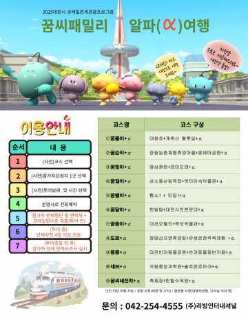 올해 프로그램은 대전의 대표 관광지와 체험형 명소를 연계한 11가지 테마코 스로 구성되며, ‘꿈씨패밀리’를 활용한 맞춤형 여행코스를 제공한다. 아울러 개별 여행객도 자유롭게 대전을 탐방할 수 있도록 ‘비대면 투어 프로그램’도 함께 운영한다.