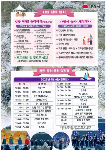 시민 참여형 행사도 다채롭다. ‘벚꽃 팡팡! 플리마켓’에서는 수제 공예품, 먹거리 등이 선보이고, ‘다함께 놀자! 체험행사’에서는 건강체험, 전통 가마솥 음식 체험, 떡메치기 체험 등 온 가족이 즐길 수 있는 부스가 운영된다. 행사장 곳곳에는 푸드트럭과 해와 달 푸드존도 운영돼 먹거리도 풍성하다.