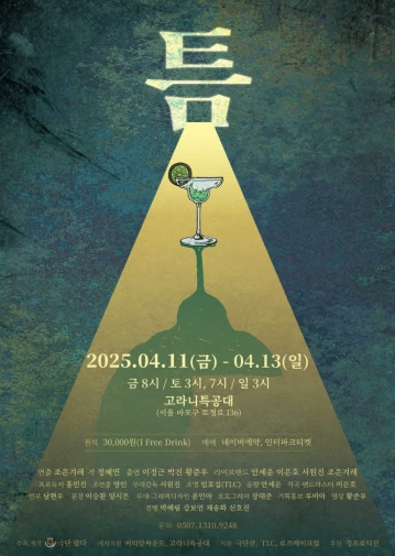 공연장에서는 많은 것이 금지된다. 음식을 먹거나 술을 마시는 것, 자유롭게 움직이며 공연을 즐기는 일은 대부분 제한된다. 그러나 오히려 그런 금지로 인해 더 끌리고, 더 갈망하게 되는 것이 인간의 심리다. 이러한 욕망에 정면으로 응답하는 특별한 공연이 2025년 봄, 서울 상수동에서 시작된다. 금지된 것을 모두 허용하는, 관객이 직접 즐기고 움직이며 참여하는 공연, 연극 **‘틈’**이 오는 4월 11일부터 13일까지 단 3일간 상수동의 복합문화공간 **‘고라니 특공대’**에서 펼쳐진다.