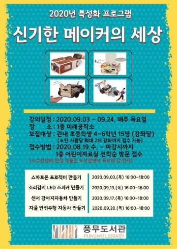 9월 3일부터 9월 24일까지 매주 목요일 16:00~18:00까지 진행되며 8월 19일부터 관내 초등 4~6학년 학생들을 대상으로 풍무도서관 어린이자료실에서 선착순 방문접수로 진행된다.