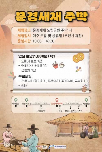 새재 주막은 과거 급제를 위해 문경새재를 오르다가 쉬어가던 옛 선비들의 삶을 모티브로 다양한 전통 체험을 할 수 있도록 기획된 주막 체험행사는 지난 2년간 매주 방문객들로부터 폭발적인 호응을 얻었다.