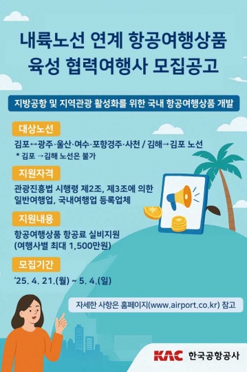 한국공항공사(사장직무대행 이정기)는 국내관광 활성화와 내수시장 진작을 위해 21일부터 5월 4일까지 2주간 '2025년 항공여행상품 개발·판매 사업'에 참여할 협력여행사를 모집한다.