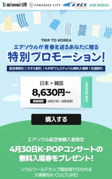 먼저, 서울시와의 협업을 통해 에어서울 일본 출발 항공권 구매 고객 대상으로 4월 30일부터 진행되는 ‘서울 스프링페스타’ 개막식인 ‘서울 원더쇼’의 입장권 100매를 추첨을 통해 무료로 제공한다. 이는 서울 상암월드컵경기장에서 개최되는 K-POP 콘서트로, 해외 팬들의 관심이 높아 이용객의 기대가 클 것으로 보인다.