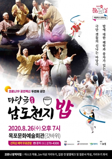 목포시는 8월 문화가 있는 날을 맞아 오는 26일 오후 19시 목포문화예술회관에서 극단 갯돌의‘마당극 남도천지밥’을 무료 공연한다.