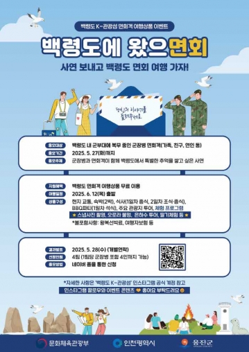 옹진군(군수 문경복)은 지난 9일, 백령도 K-관광섬 육성사업의 일환으로 백령도 군(軍) 면회객을 위한 여행상품을 시범운영 한다고 밝혔다. 이 상품은 대한민국 최북단에 위치한 백령도의 특색을 활용한 상품으로 기획되었으며, 면회객 사연 공모를 통해 참여 희망자를 선발하여 특별한 면회 여행 기회를 제공한다.