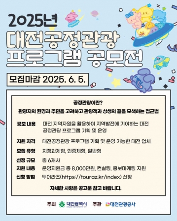 대전광역시와 대전관광공사는 지역 고유의 자원을 보존하고 지역사회와의 상생을 추구하는 ‘공정관광’ 생태계를 조성하기 위한 노력의 일환으로 오는 5월 19일(월)부터 6월 5일(목)까지 ‘2025년 대전공정관광 프로그램 공모전’을 개최한다고 밝혔다.