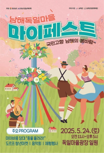 마이페스트는 독일에서 매년 5월, 봄의 도래와 한 해의 풍요를 기원하며 열리는 전통적인 축제로, 마을 광장에 ‘마이바움(Maibaum, 5월의 기둥)’을 세우고 노래와 춤으로 축복을 나누는 것이 주요 행사다. 남해군은 2022년부터 이 독일의 전통 문화를 기반으로 한 봄 축제를 매년 개최하고 있으며, 올해로 4회를 맞은 이번 축제는 지역민과 관광객 모두가 함께 즐길 수 있는 프로그램으로 풍성하게 채워진다.