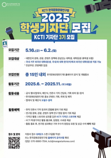 한국문화관광연구원(원장 김세원, 이하 연구원)은 ‘2025년 KCTI 학생 기자단’ 제3기를 모집한다고 19일 밝혔다.