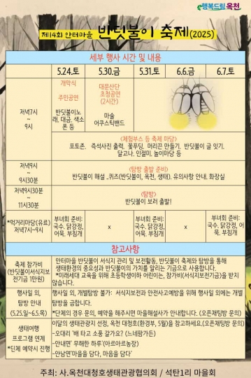 충북 옥천군 동이면 석탄1리 안터마을에서 자연의 신비로움을 만날 수 있는 특별한 축제가 열린다. 주민 주도로 오랜 시간 지켜온 반딧불이 서식지의 생태적 가치를 널리 알리고, 자연과 함께하는 힐링의 시간을 제공하는 ‘제14회 안터마을 반딧불이 축제’가 오는 5월 24일부터 6월 7일까지 매주 금요일과 토요일 총 5일간 개최된다.