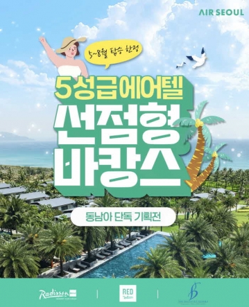에어서울(대표이사 김중호)이 다가오는 여름 성수기에 대비해 동남아 여행을 경제적으로 준비할 수 있는 '5성급 에어텔 선점형 바캉스' 프로모션을 진행한다고 22일 밝혔다.