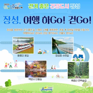 장성군이 ‘2025 장성 방문의 해’를 앞두고 지역 대표 명소를 즐기며 건강도 챙길 수 있는 스마트 관광 프로그램, ‘장성, 여행하고(Go)! 걷고(Go)! 워크온 챌린지’를 본격 운영한다. 이는 장성을 찾는 관광객과 군민 모두가 쉽게 참여할 수 있도록 설계된 디지털 기반 참여형 이벤트로, 걷기 좋은 도시 장성의 이미지를 한층 강화할 것으로 기대된다.