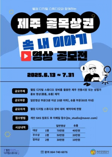 참가자들은 웰컴 디지털 스튜디오의 장비를 활용해 제주의 전통시장과 상점가를 배경으로 한 CF(광고 영상물), 브이로그(Vlog), 단편영화 등 자유 형식의 영상 콘텐츠를 제작할 수 있으며, 완성된 영상을 본인의 SNS 계정에 업로드한 뒤, 해당 링크를 이메일(jto_studio@naver.com)로 제출하면 접수가 완료된다.