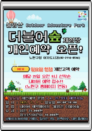 서울 노원구(구청장 오승록)가 자연 속에서 온몸으로 즐기는 모험 체험 공간 ‘불암산 더불어숲 체험장’의 개인 예약 시범 운영을 오는 7월부터 본격적으로 시작한다. 그동안 단체 중심으로만 운영돼온 이 공간이 개인 및 가족 단위 이용객에게도 개방됨에 따라, 더욱 많은 주민이 야외에서 다양한 체험을 즐길 수 있게 됐다.