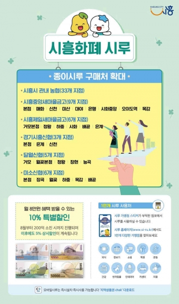 소비자는 1인당 월 80만원 한도로 시흥화폐 시루(지류권)를 10% 특별할인 혜택 받아 구매할 수 있다. 10% 특별할인 기간은 8월부터 예산 소진 시까지이다.