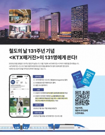 이번 이벤트의 참여자는 추첨을 통해 KTX 운임 30% 할인권을 제공받으며, 그 중 1명에게는 100만 원 상당의 ‘노보텔 앰배서더 서울 용산’ 수페리어 객실 1박과 푸드익스체인지 뷔페 2인 이용권이 추가로 증정된다. 이 이벤트는 7월 20일까지 진행되며, 당첨자는 7월 28일 KTX매거진의 공식 인스타그램(@ktxmagazine)을 통해 발표된다.
