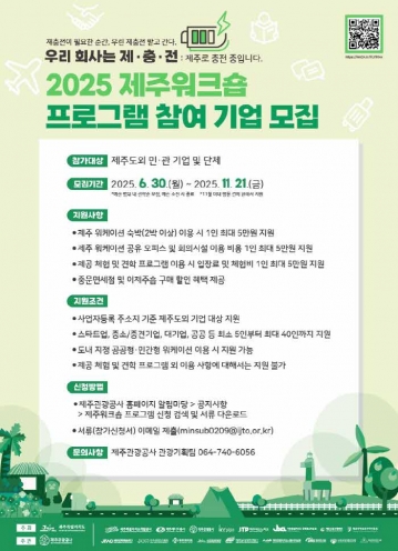 제주특별자치도와 제주관광공사(사장 고승철)는 오는 11월 21일까지 도외 민간기업 및 공공기관, 단체 등을 대상으로 ‘2025년 기업 워크숍 유치프로그램(JEJU Workshop)’을 운영한다고 1일 밝혔다. 제주형 워케이션과 기업관광 활성화 및 제주 방문 수요 확대를 목표로 추진하는 이번 프로그램은 제주관광공사 등 도내 17개 공공기관의 협업을 통해 진행된다.