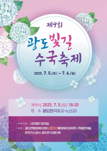 통영시 광도면의 여름을 수놓는 대표적인 지역 축제, ‘제9회 광도빛길 수국축제’가 오는 7월 5일(토)과 6일(일) 이틀간 광도천 일원에서 화사하게 펼쳐진다. 형형색색 수국꽃과 다채로운 문화 콘텐츠가 어우러지는 이 축제는 사단법인 빛과길(이사장 이명해)이 주최·주관하며, 매년 많은 시민과 관광객의 발길을 이끄는 광도면의 대표 여름 축제로 자리매김하고 있다.