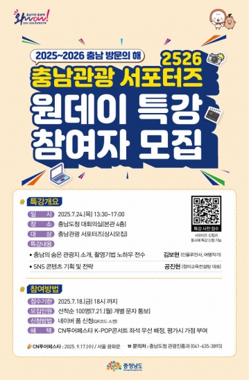 특강 참여자에게는 특별한 혜택도 제공된다. 오는 9월 17일 서울 광화문 광장에서 열리는 ‘씨엔(CN)투어페스타’ K-POP 콘서트 관람 시 좌석 우선 배정 혜택이 주어지며, 연말 서포터즈 활동 평가 시 가점도 부여된다. 특강 신청은 안내 포스터에 있는 QR코드를 통해 간편하게 진행할 수 있다.