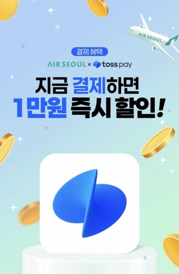 이번 이벤트는 에어서울에서 토스페이로 첫 결제 및 30만 원 이상 결제하는 고객을 대상으로 하며, 1만 원의 즉시 할인 혜택이 제공된다. 국내선 및 국제선 전 노선에 사용할 수 있으며 복잡한 절차 없이 결제 단계에서 바로 할인을 받을 수 있어 편리하다.