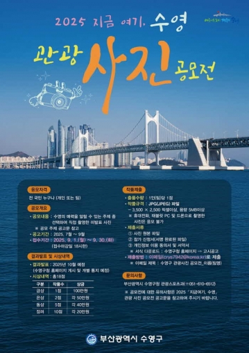 강성태 수영구청장은 “이번 사진 공모전을 통해 수영구의 매력적인 모습이 널리 알려지길 기대한다”며 “많은 시민들이 참여해 일상 속 수영의 아름다움을 새롭게 발견하는 계기가 되기를 바란다”고 전했다.