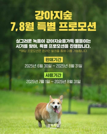 강아지숲 7~8월 온라인 특별 프로모션에 관한 자세한 정보는 강아지숲 공식 홈페이지 및 인스타그램 채널을 통해 확인할 수 있다.