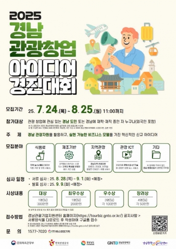 ‘2025 경남 관광 창업 아이디어 경진대회’에 대한 자세한 내용은 운영사무국(1577-7820) 또는 경남관광기업지원센터 공식 누리집에서 확인할 수 있다.