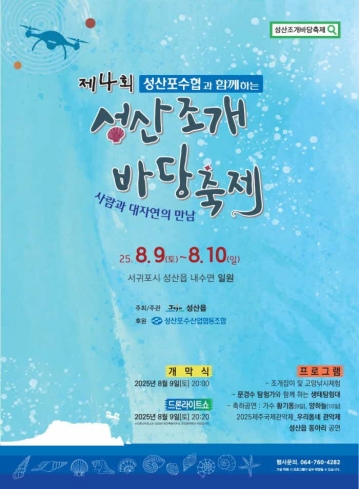 문화 공연 프로그램도 지역 주민과 관광객 모두의 눈과 귀를 사로잡을 예정이다. 첫날인 9일(토)에는 가수 황기동의 흥겨운 무대와 함께, 제주국제관악제 초청으로 독일의 피닉스 파운데이션과 밤벨스 전문악단의 수준 높은 연주가 펼쳐진다. 다음 날인 10일(일)에는 지역 주민들이 참여하는 노래자랑과 동아리 공연, 가수 양하늘의 축하공연이 열려 축제 분위기를 한층 고조시킬 예정이다. 특히 축제 첫날 밤에는 성산의 생태, 조개잡이 문화, 그리고 자연과 인간의 공존을 주제로 한 드론 라이트쇼가 성산 내수면의 밤하늘을 환상적으로 수놓으며, 이번 행사의 백미가 될 것으로 기대된다.