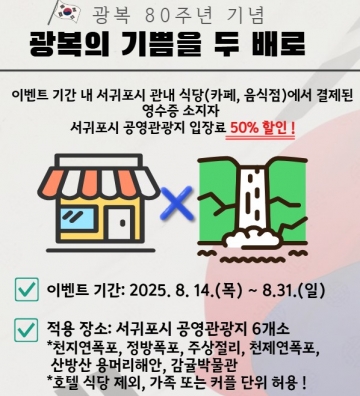 서귀포시는 광복 80주년을 기념해 8월 14일부터 31일까지 서귀포시 내 음식점 영수증을 지참한 방문객에게 공영 관광지 입장료 50% 할인 혜택을 제공하는 특별 행사를 진행한다. 이번 행사는 광복 80주년의 역사적 의미를 되새기고, 지역 상권과 관광지를 연계해 지역경제를 활성화하기 위해 마련됐다.