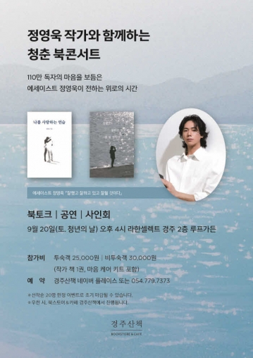 이번 ‘청춘 북콘서트’는 9월 20일 토요일 오후 4시 라한셀렉트 경주 2층 야외 숲속 정원 루프가든에서 진행된다. 정영욱 작가와 함께 청춘들의 꿈과 고민을 나누는 북토크와 더불어 마음을 어루만지는 연주회도 열린다. 초가을 오후, 너와 나의 이야기가 모두에게 응원의 메시지가 되는 따뜻한 경험을 선사할 예정이다.