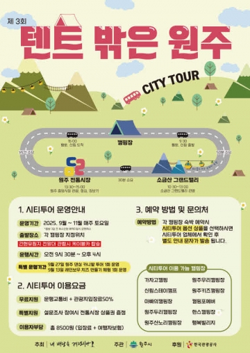 홍순필 관광과장은 “콘텐츠형 버스는 캠핑장을 거점으로 관광객이 원주의 다양한 매력을 한눈에 경험할 수 있도록 기획된 프로그램”이라며 “앞으로도 테마형 시티투어버스를 지속적으로 발굴해 원주 관광의 경쟁력을 높여가겠다”고 말했다.
