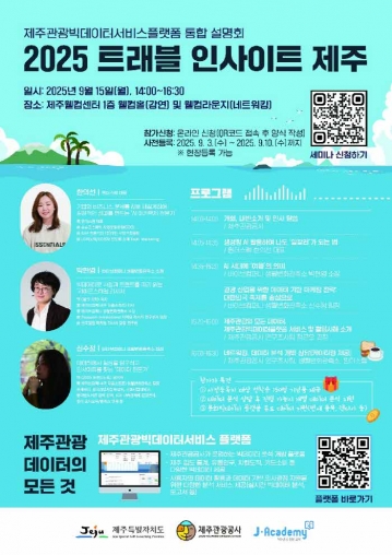 제주특별자치도와 제주관광공사(사장 고승철)는 오는 9월 15일 제주웰컴센터에서 ‘2025 트레블 인사이트 제주’ 세미나를 개최한다고 밝혔다. 이번 세미나는 제주관광 빅데이터 서비스 플랫폼 설명회와 연계해 열리며, 관광산업에 관심 있는 도민을 대상으로 생성형 인공지능 활용법, 관광산업 인사이트, 데이터 기반 실제 사례를 공유하는 자리가 될 예정이다.