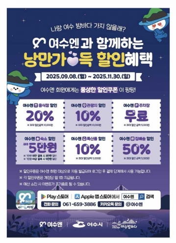 정기명 여수시장은 “가을철 다양한 축제와 행사 기간에 맞춰 여수를 찾는 관광객들이 ‘여수엔’을 통해 다채로운 혜택을 누리길 기대한다”며 “앞으로도 관광객 만족도를 높이고 지역 상권과 함께 성장하는 관광도시 여수를 만들기 위해 최선을 다하겠다”고 밝혔다.
