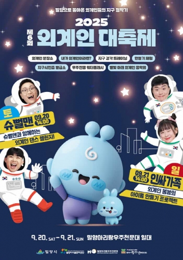 공연 프로그램도 눈길을 끈다. 매일 오후 2시 인기 인플루언서 공연이 열리며, 20일(토)에는 유튜브 채널로 유명한 ‘슈뻘맨’, 21일(일)에는 ‘인싸가족’이 출연해 현장을 뜨겁게 달굴 예정이다. 사이언스 버스킹, 버블쇼, AI 그림그리기 대회 등 다채로운 무대와 체험도 함께 진행된다. 특히 20일 오후 1시 30분에는 ‘외계인의 밀양 전입신고 퍼포먼스’가 개막식 무대로 펼쳐지며, 저녁 7시에는 통기타 뮤지션 이봉하와 다양한 공연진이 참여하는 감성 가득 음악회가 방문객들의 가을밤을 물들인다.