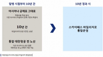 이번 마일리지 통합방안에 따르면 대한항공과 아시아나항공이 통합되는 시점부터 10년 간 ▲기존 아시아나항공 아시아나클럽 마일리지를 구 아시아나 마일리지 형태로 보유하는 회원 ▲대한항공 스카이패스 마일리지만 보유하는 회원(구 아시아나 마일리지를 대한항공 스카이패스로 전환 포함)으로 구분된다. 10년이 지난 시점에는 모두 대한항공 스카이패스 마일리지로 통합된다.