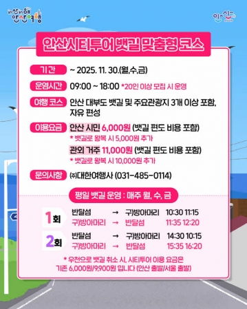 안산시(시장 이민근)는 오는 11월 30일까지 안산시티투어와 안산–대부도 뱃길을 연계한 ‘안산시티투어 뱃길 맞춤형 코스’ 특별 이벤트를 운영한다고 10일 밝혔다. 이번 프로그램은 지난 8월 13일 정식 개통된 안산–대부도 뱃길을 관광 자원으로 확대하고, 시티투어와 연계함으로써 대부도 관광의 접근성과 체험 요소를 강화하기 위해 마련됐다.