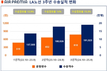 특히 LA 노선을 운항하는 국적 항공사 중 에어프레미아의 수송 점유율은 3년 연속 상승세를 보였다. 2022년 12.9%에서 2023년 14%, 2024년에는 15.3%로 확대돼, 3년 평균 14.1%의 점유율을 기록하며 명실상부 미주 장거리 시장의 주요 항공사로 자리잡았다.