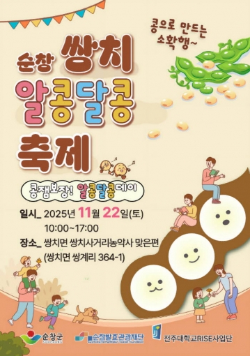 순창군이 오는 11월 22일 토요일, 쌍치면 일원에서 ‘2025 순창 쌍치 알콩달콩 축제’를 개최한다. 순창군과 순창발효관광재단, 전주대학교 RISE사업단이 공동 주최하는 이번 축제는 지역소멸에 대응하는 차별화된 마을축제로, 쌍치면 고유의 자원인 ‘쌍치콩’을 중심으로 다양한 체험과 공연, 먹거리 프로그램을 선보이며 관광객과 지역 주민이 함께 즐기는 화합의 장을 만들 예정이다.