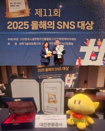 이번 수상은 지난 10월 개최된 ‘2025 대한민국 SNS 대상’에서 공사부문 최우수상을 수상한 데 이어 또 한 번의 성과로, 대전관광공사가 디지털 홍보 분야에서도 경쟁력을 갖춘 기관임을 다시 한 번 입증했다.